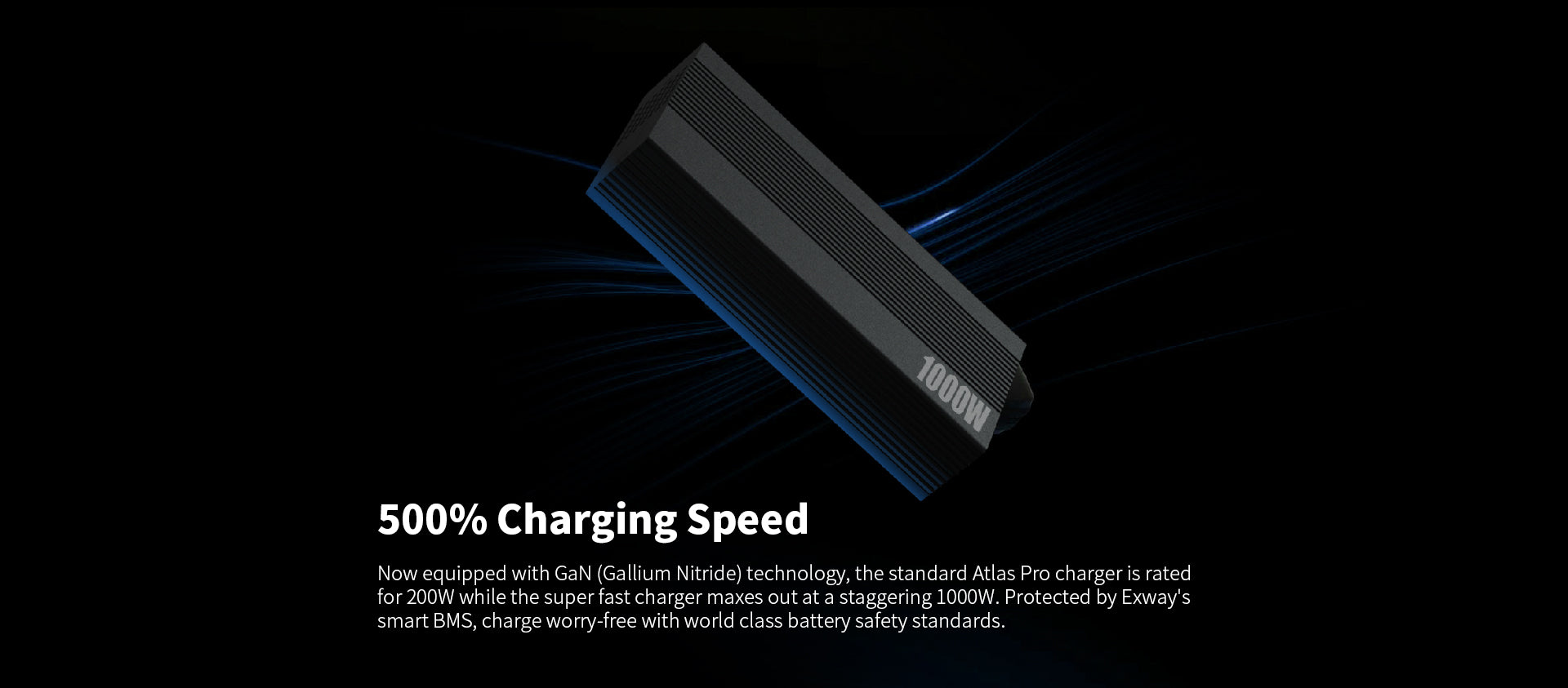 0–100% in just 1.8 hours (using 1000W Exway Super Charger)