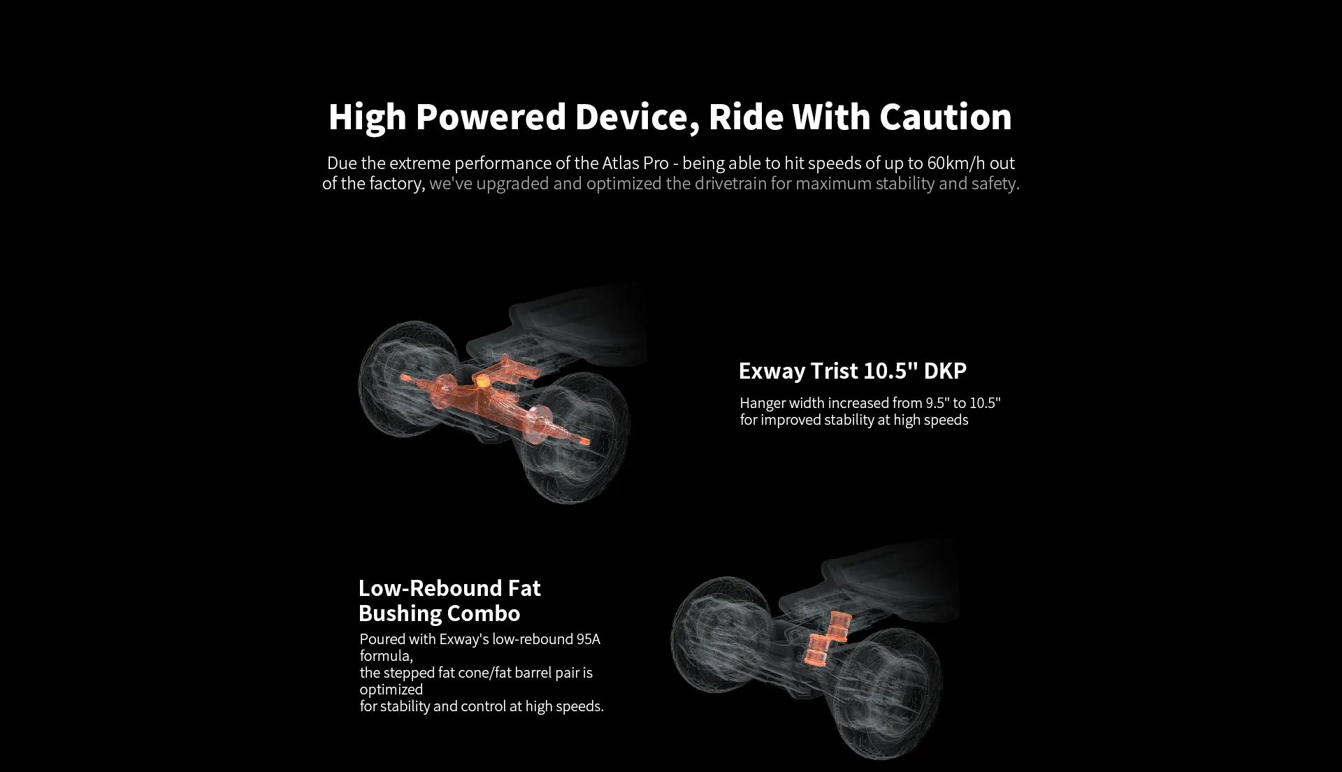 - Insane acceleration. Shop for Exway Atlas Pro and jet like the Energizer Bunny at 70 km/h. Don’t worry about overdoing it – the powerful brakes are there to cool you down when needed.