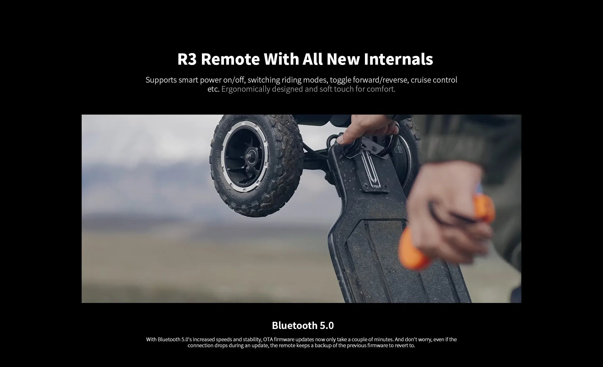 Time taken for firmware upgrades has been drastically reduced, from 20 minutes to 4 minutes on average. For improved OTA firmware upgrade stability and speed, the new R3 remote and 3rd gen ESC uses Bluetooth 5.0 to communicate with the ExSkate app.