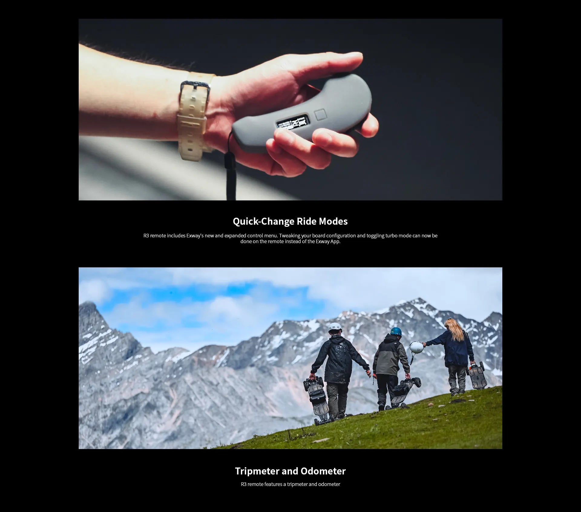 - 100% control. Nail your airs, fakies, and other signature tricks with no effort, thanks to extra-wide pulleys and improved bushing. Plus, the Exway app is always there to show your route or switch acceleration modes on the fly, so you never stop the ride.