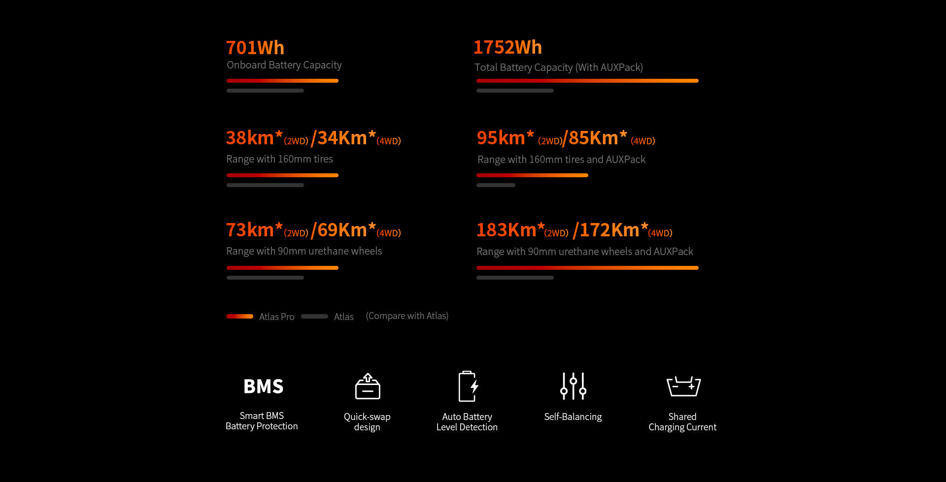 Up to 109 km (68 miles) with Atlas Pro 2WD (160mm tires)