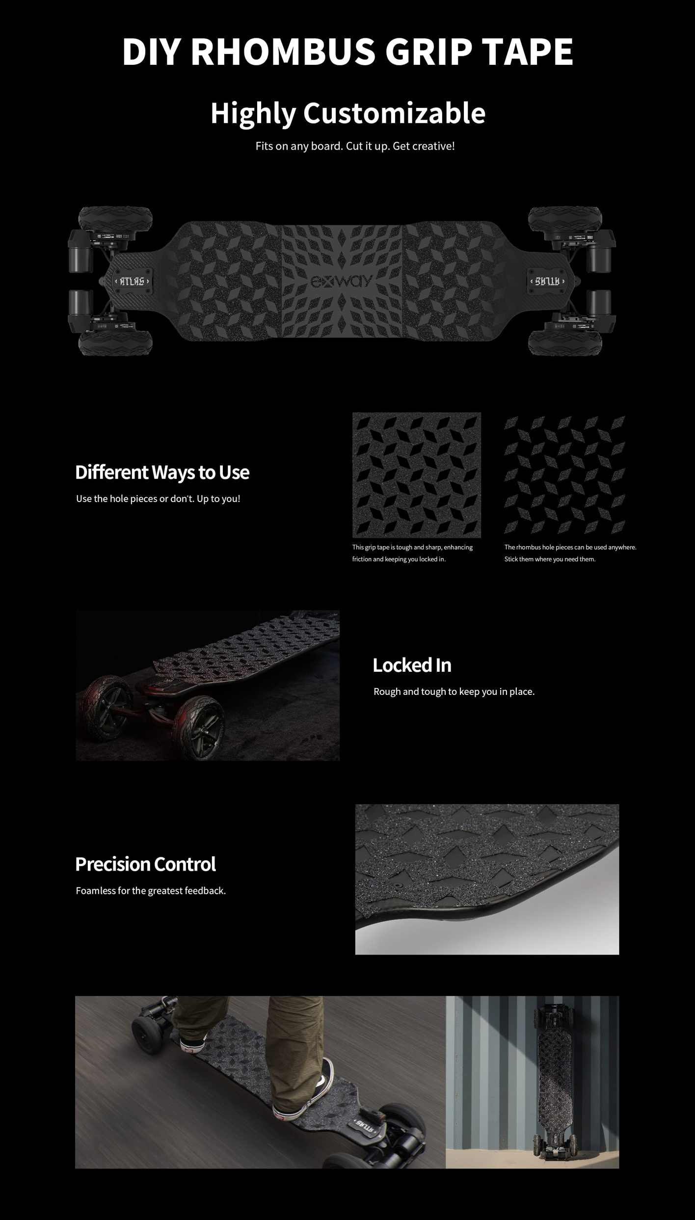 This Grip Tape is suitable for all electric skateboards. It has strong adhesion, the whole piece is square, you can freely cut the shape you like.